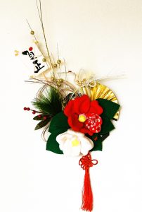紅白の椿がモダンな「お正月飾り」を、水引や吉祥鶴などをアレンジして和布で作ります。