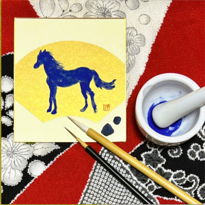 日本画の青「アズライト(藍銅鉱)」の原石をすり潰した岩絵の具で、新春を飾るミニ絵画を描きます。